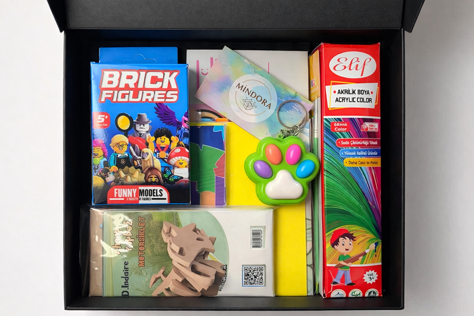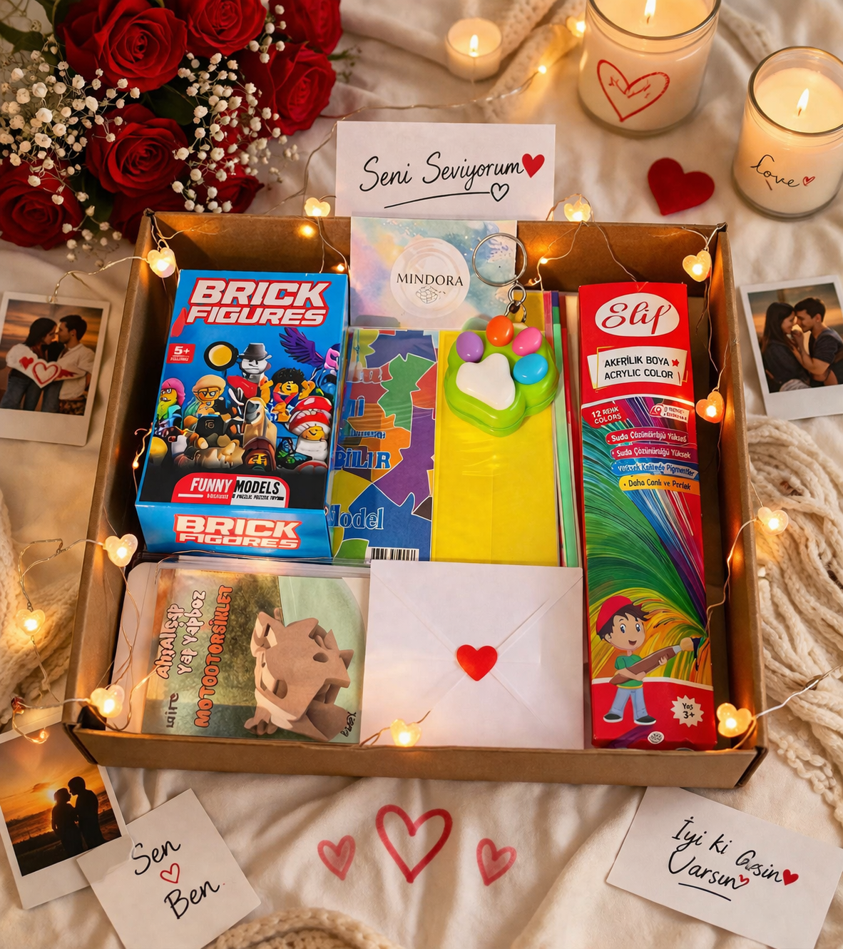 Kutunun içinde birlikte yapabileceğiniz özel aktiviteler, yaratıcı malzemeler ve tatmin duygusu bulunur.